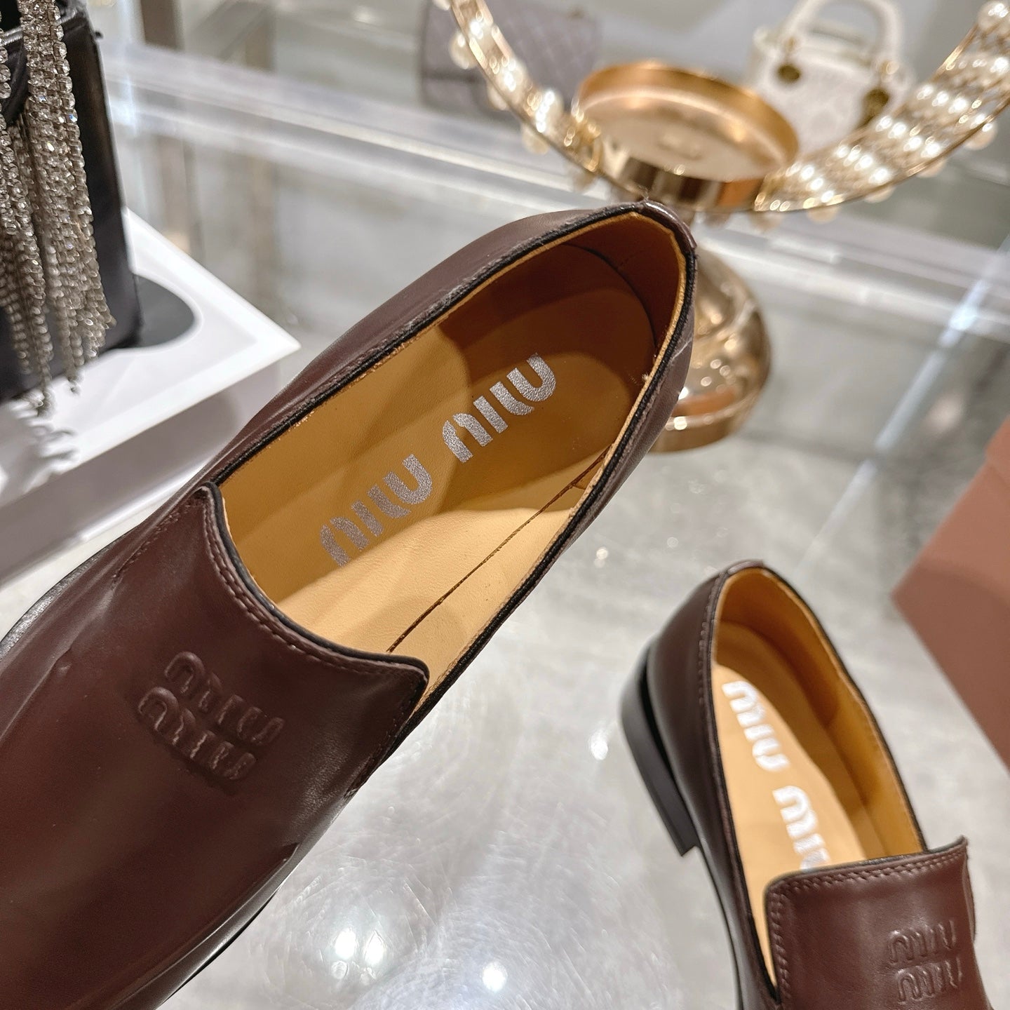 Miu Distressed Loafers Brown Cowhide 592053