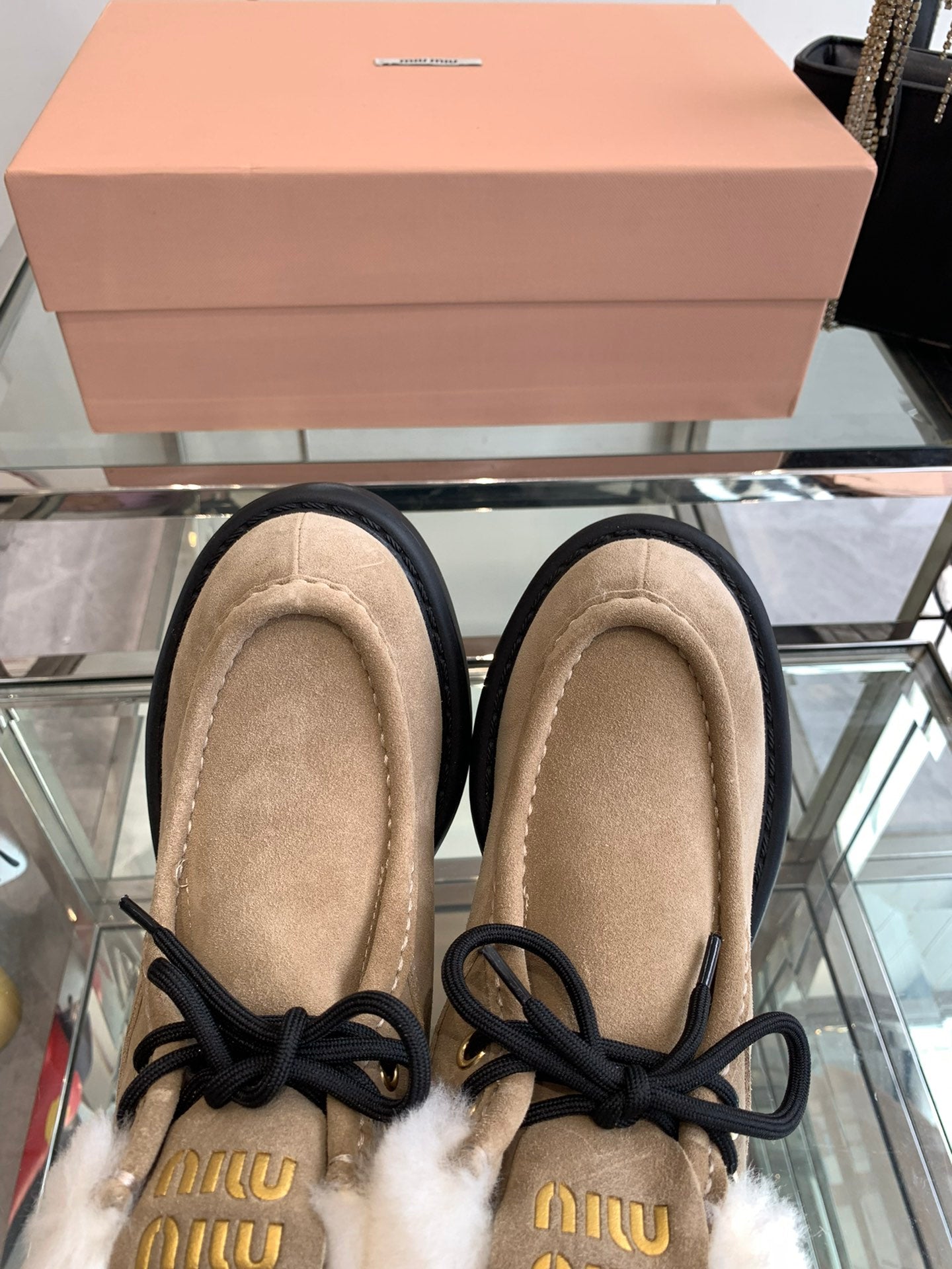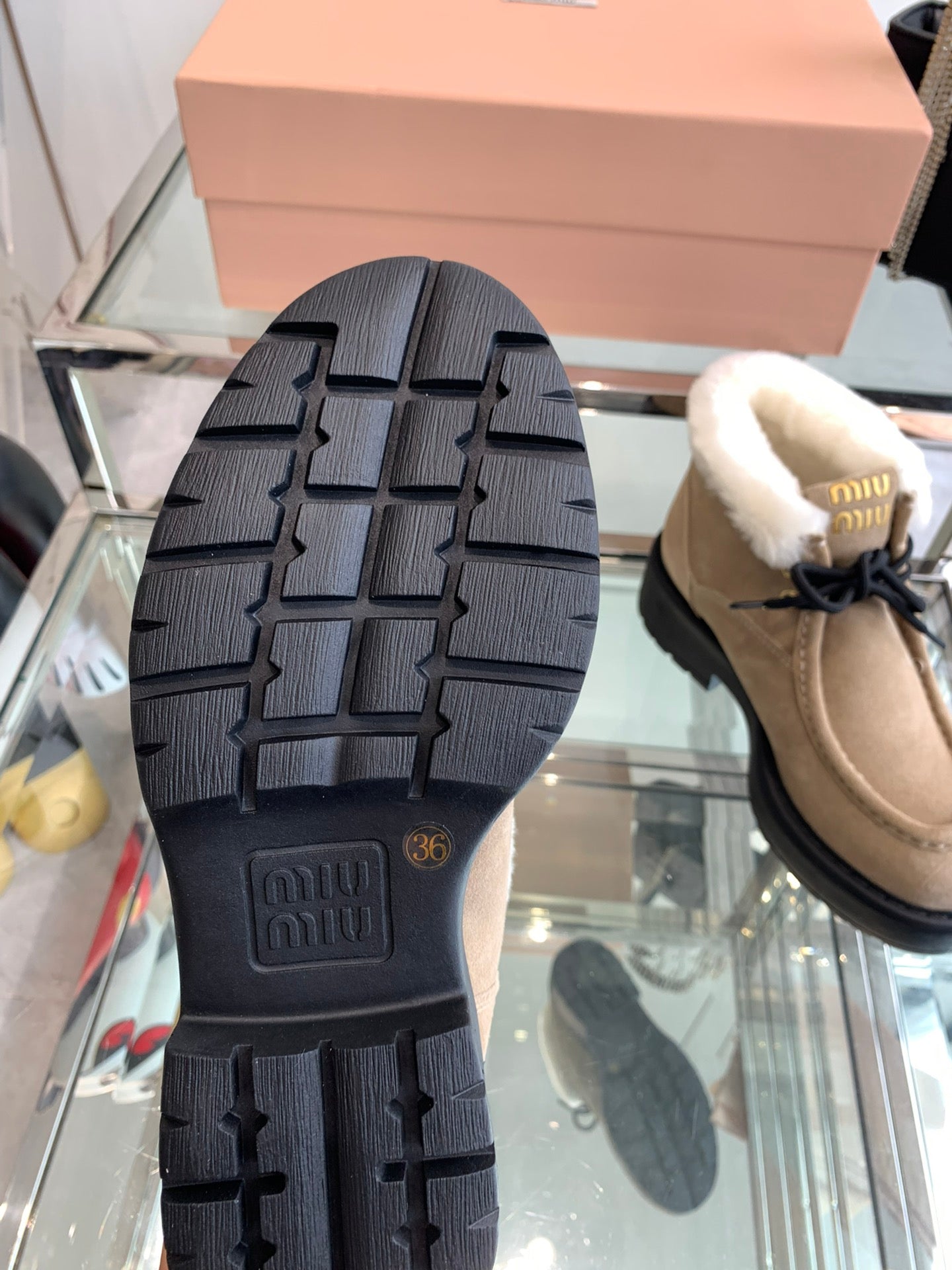 Miu Short Wool Boots Khaki Brown Open-Hemmed Cowhide