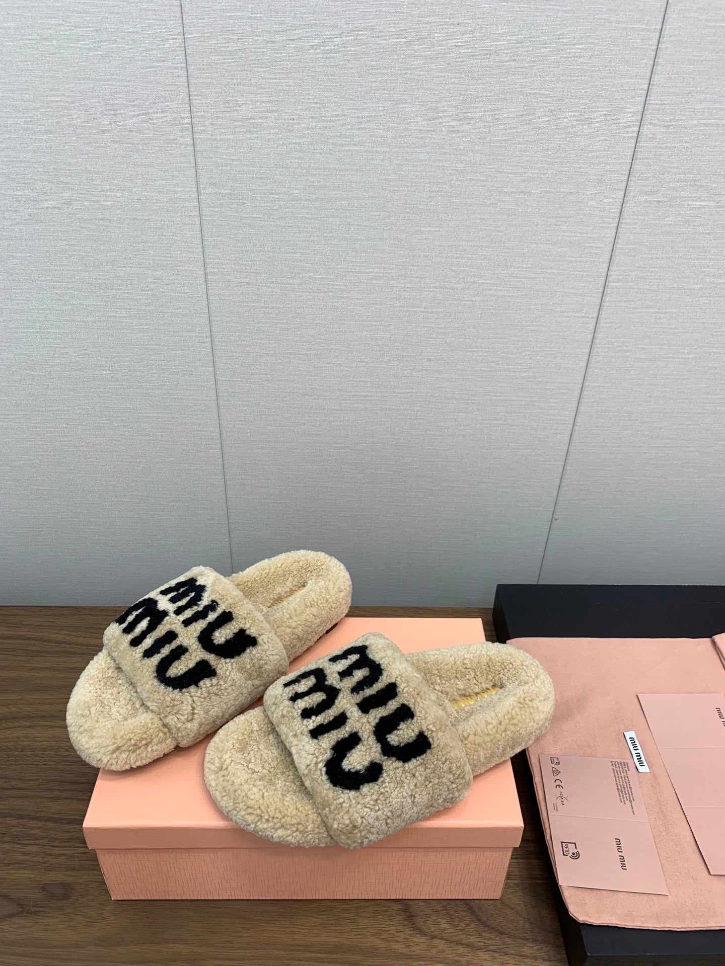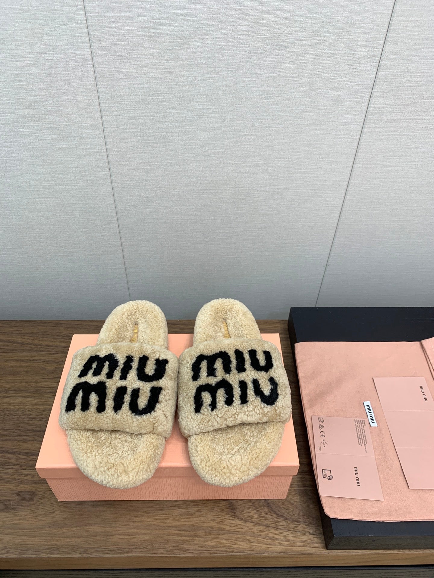 Miu slippers Beige With Black Lettering Pure Wool