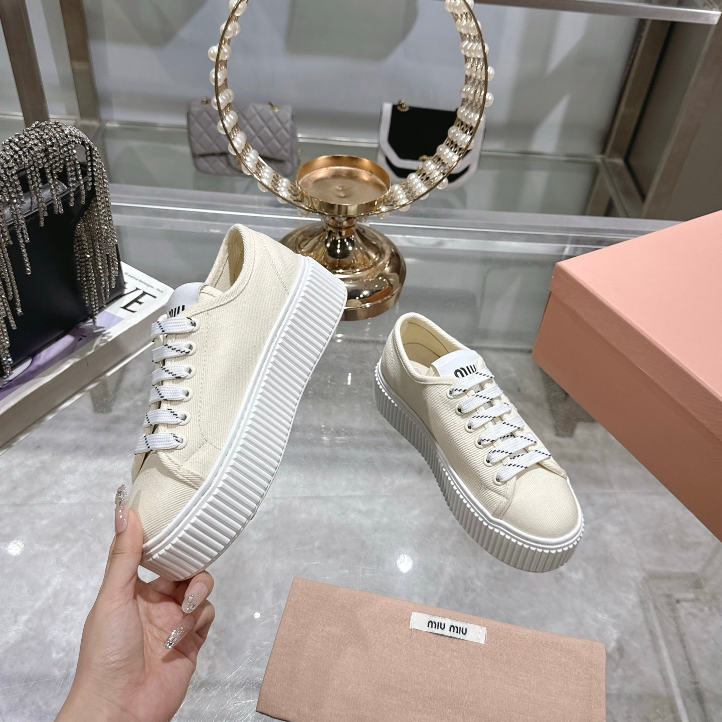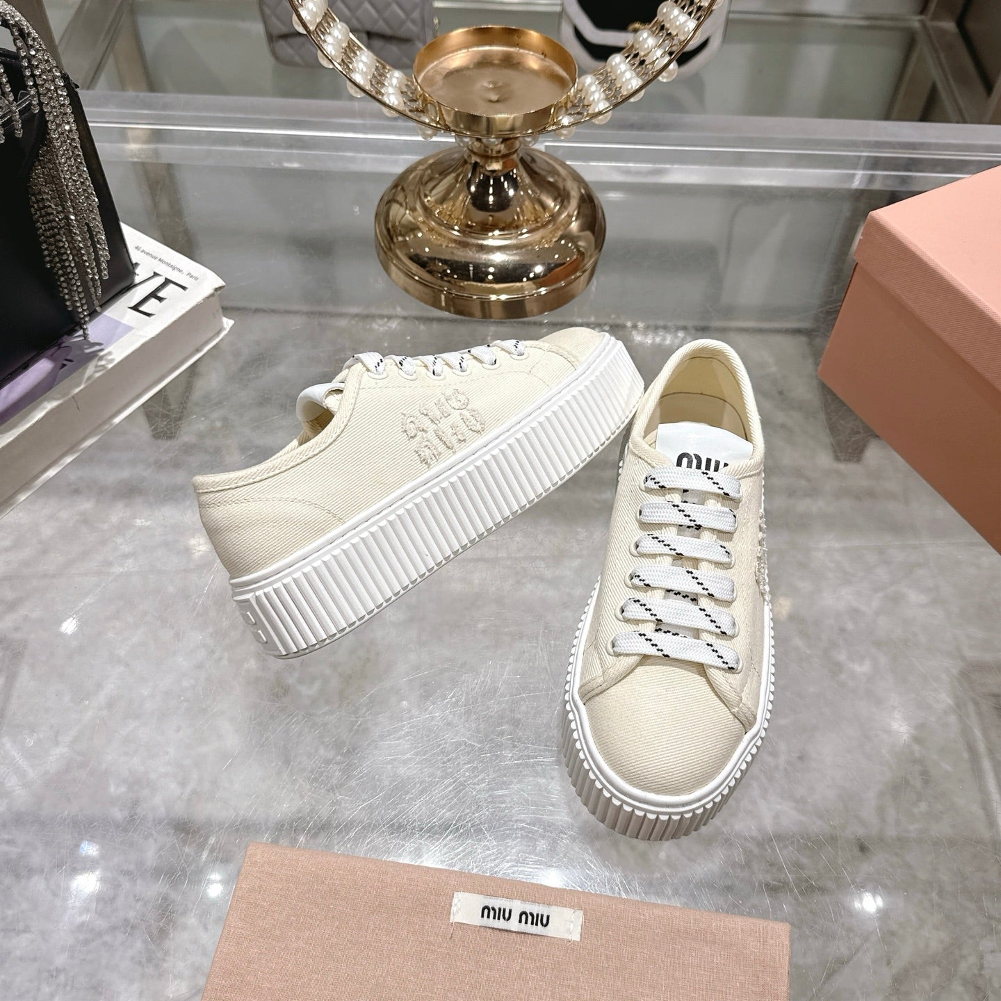 Miu Sneaker with Logo Ivory Demin Fabric 235310