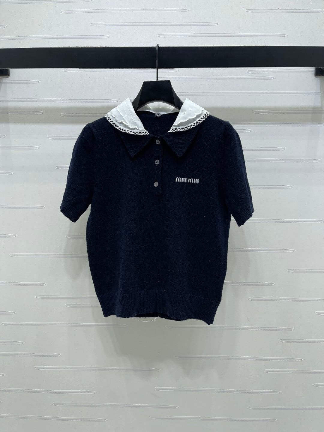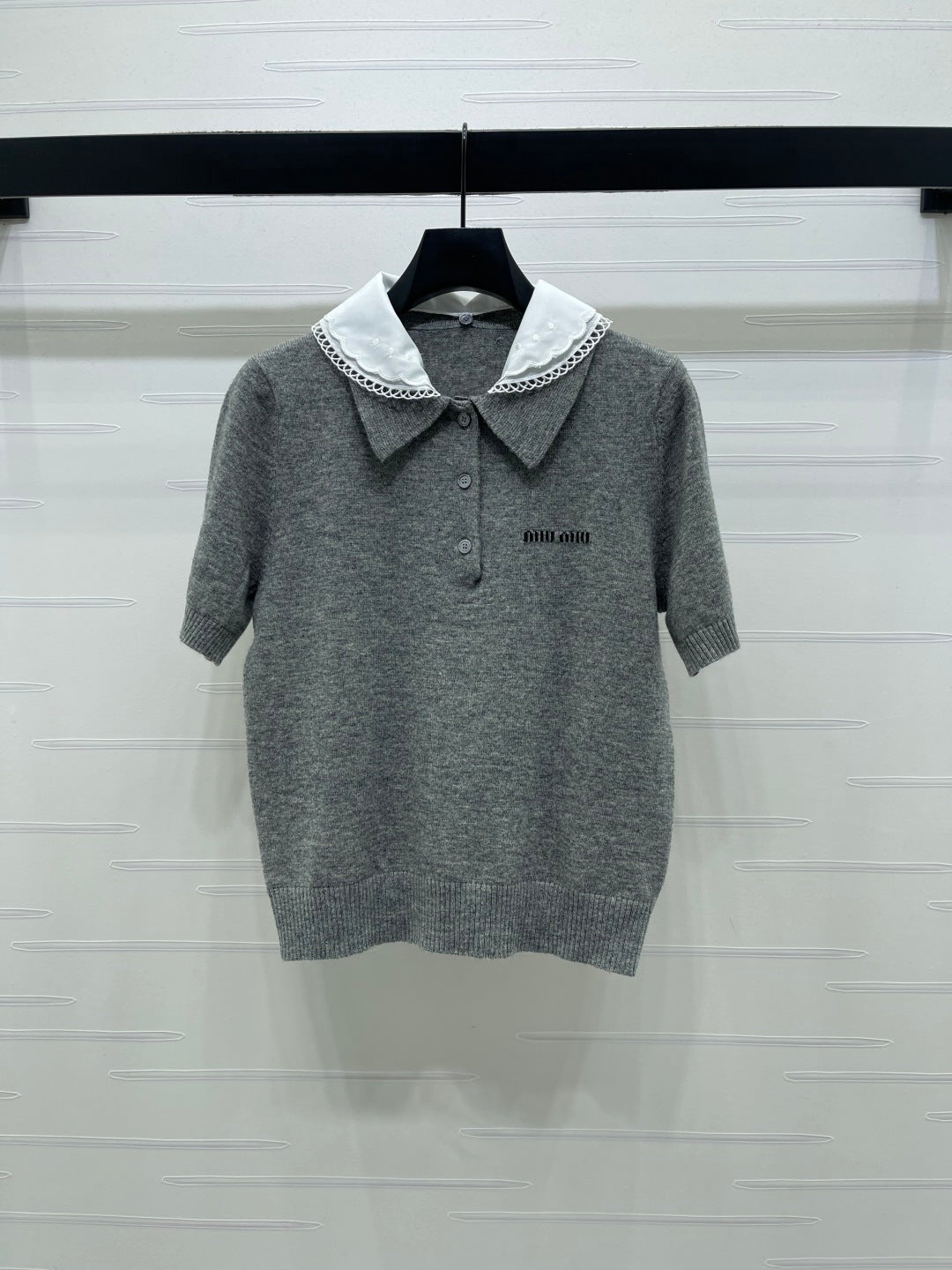 Miumiu 2026 Pan Collar Knit Short-Sleeve T-Shirt Gray and Navy Blue Wool