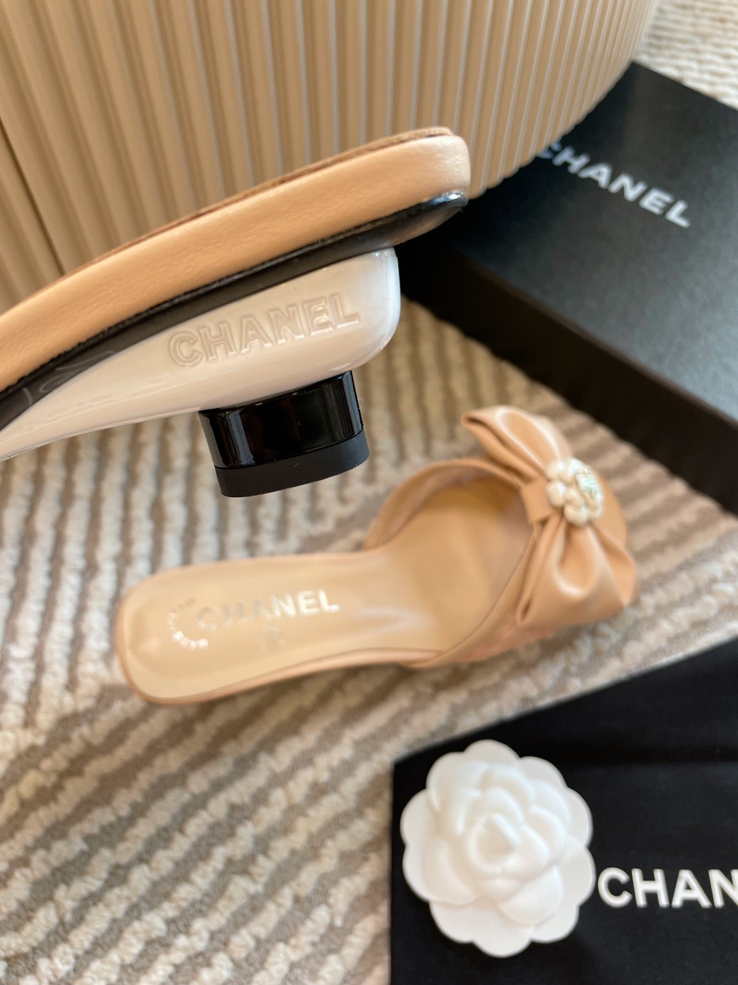 mule sandal bow flower beige calfskin