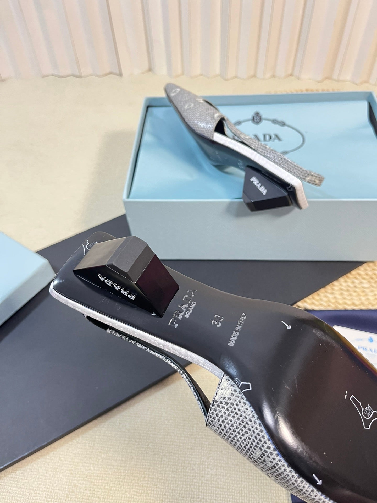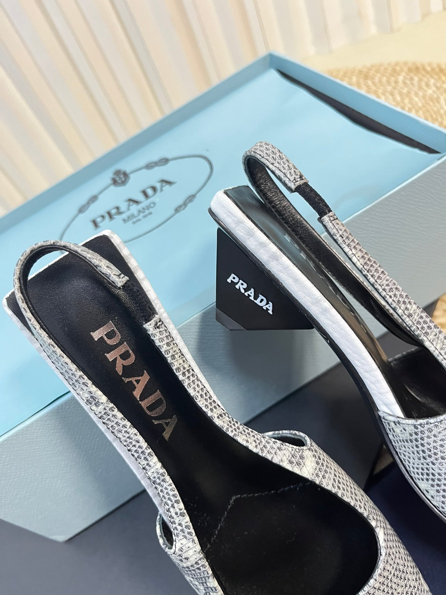 PRA SQUARE TOE SLINGBACK PUMPS PALE SNAKESKIN MOTIF SATIN