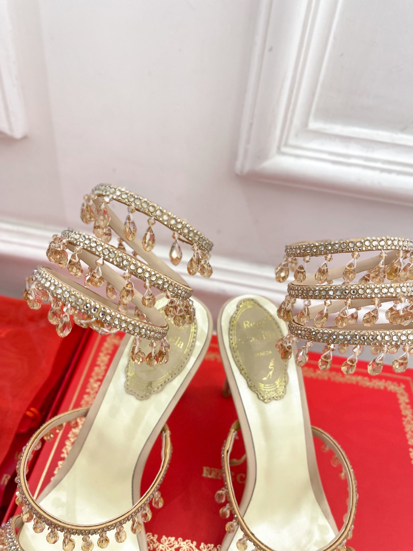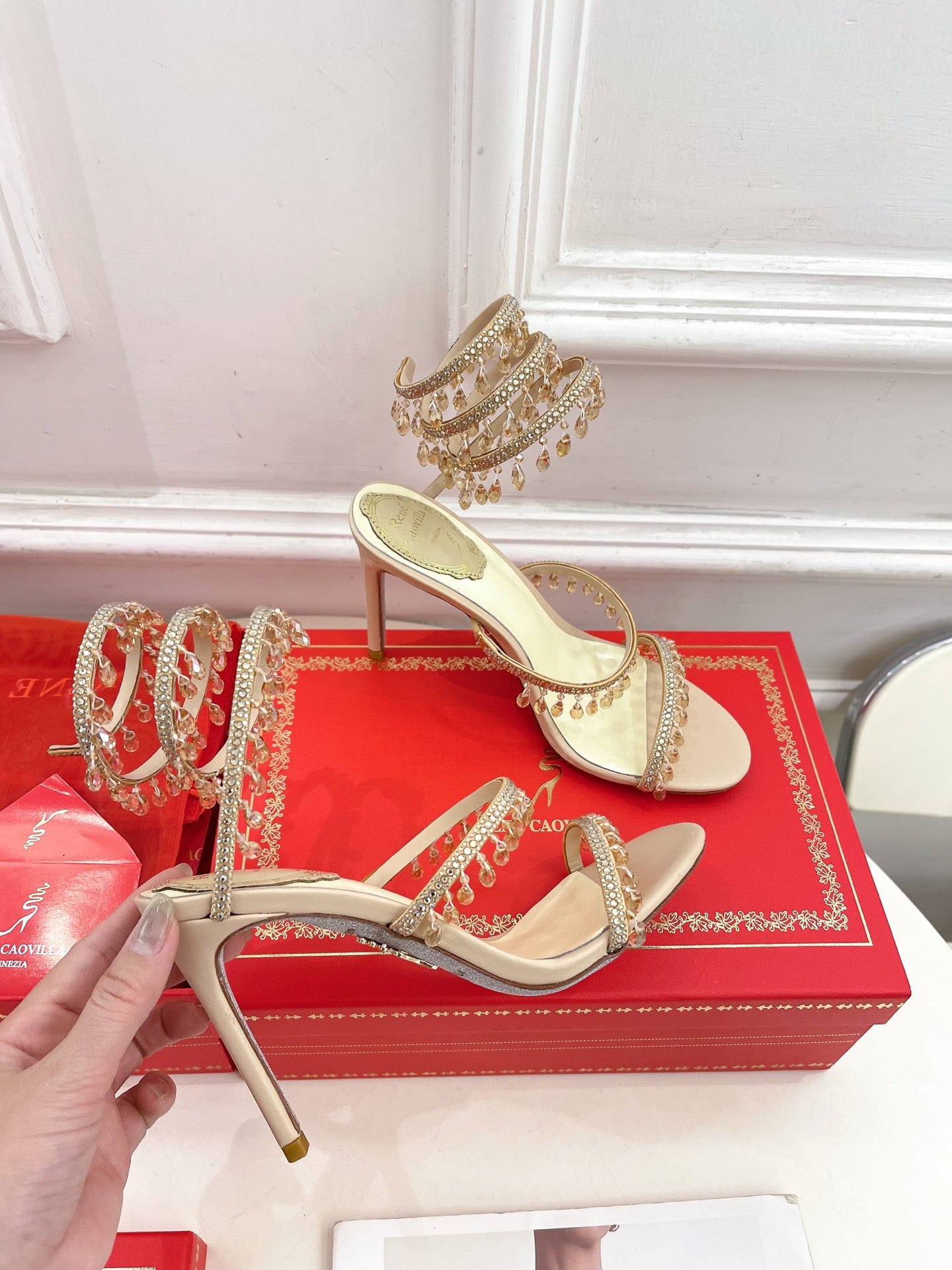 RC 25 Crystal Tassel High-Heeled Sandals Pink Nude Silk Crystal Diamond 251008