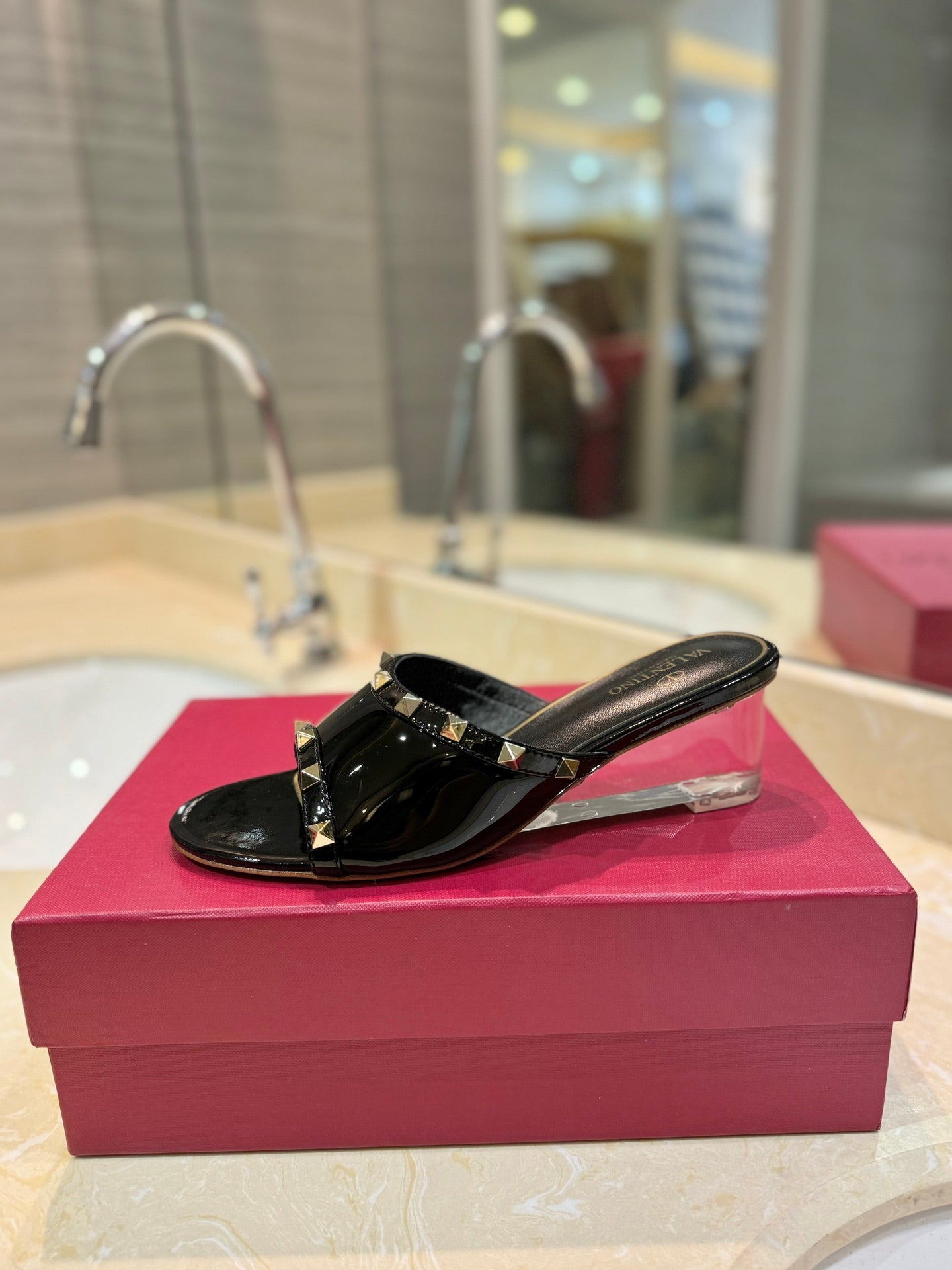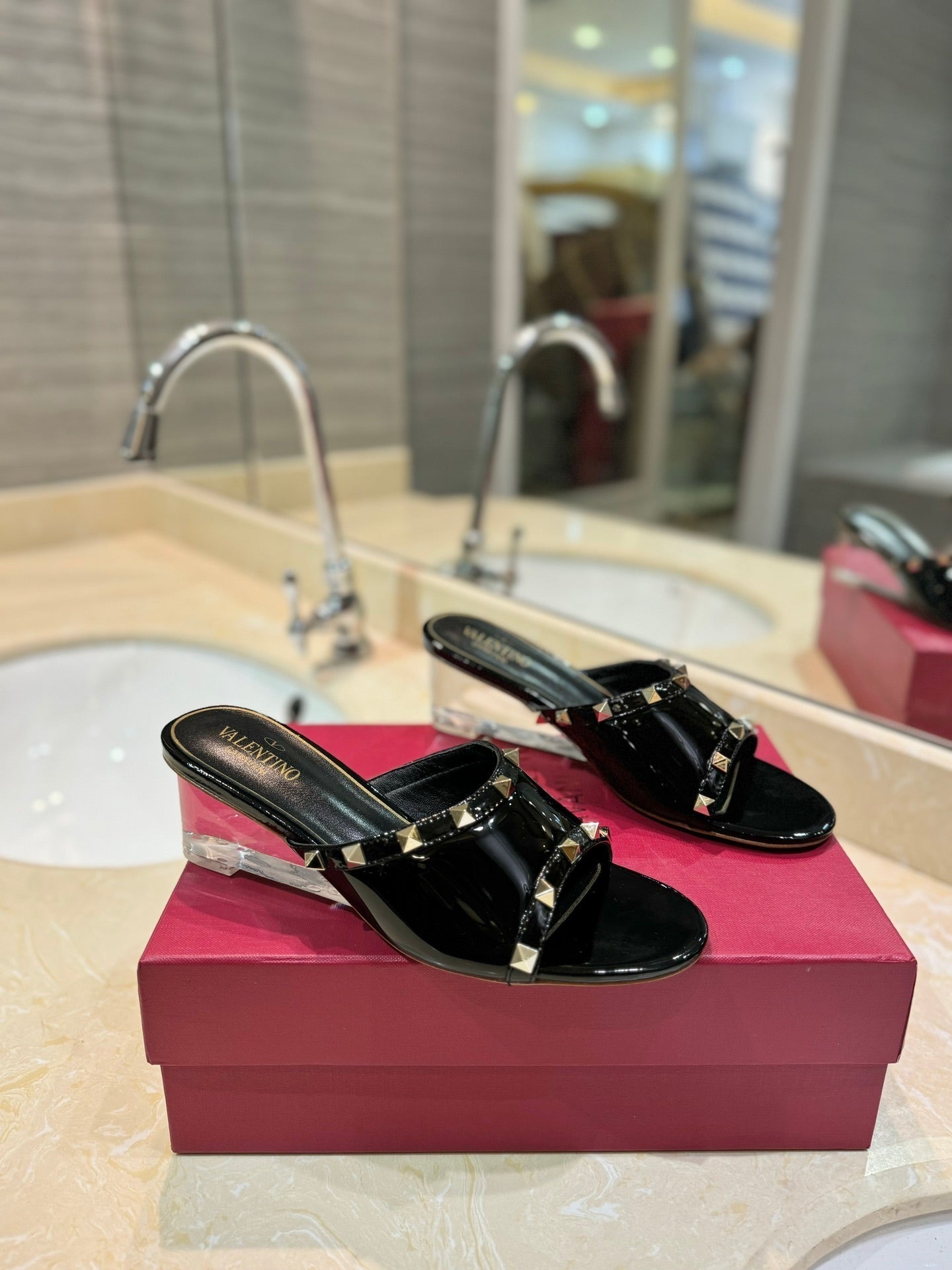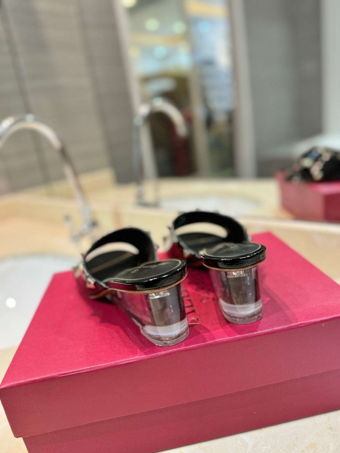 ROCKSTUD MULE SANDALS WITH TRANSPARENT HEEL IN BLACK CALFSKIN
