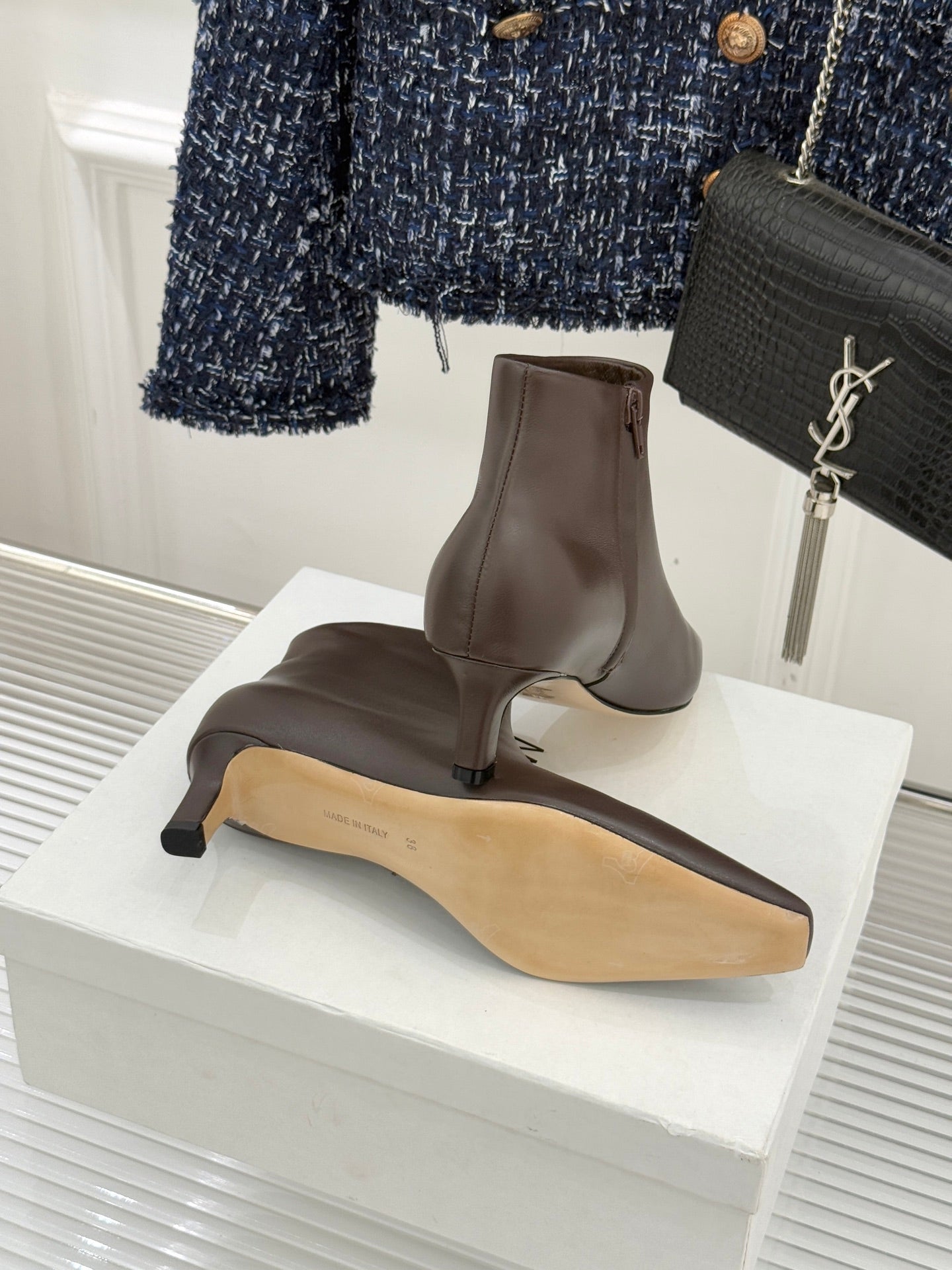The Row 2025 Square Toe Kitten Heel Ankle Boot Dark Brown Sheepskin 572048