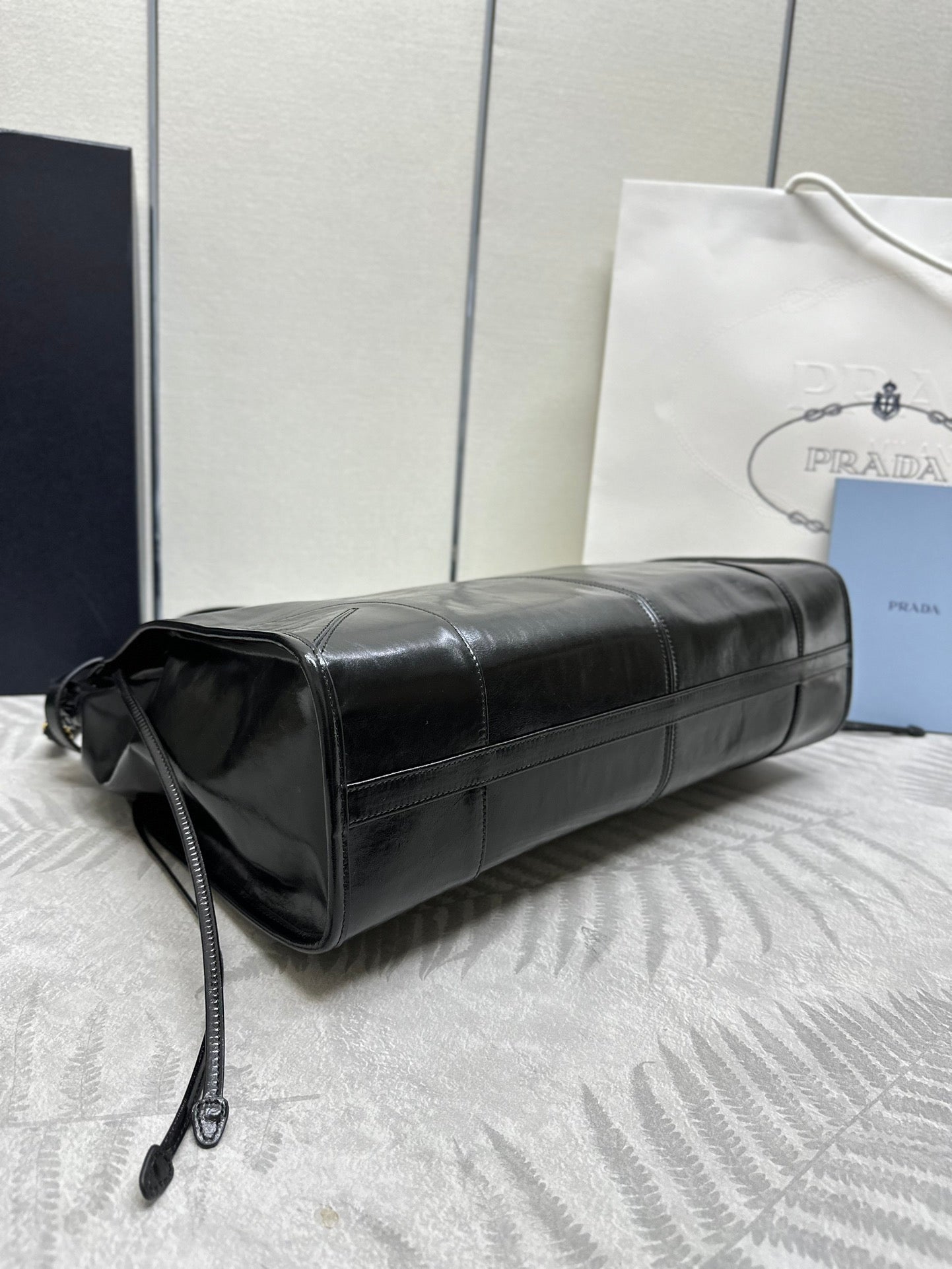 TOTE BAG WITH BELT 42 IN BLACK OIL WAX LAMBSKIN GOLD HARDWARE