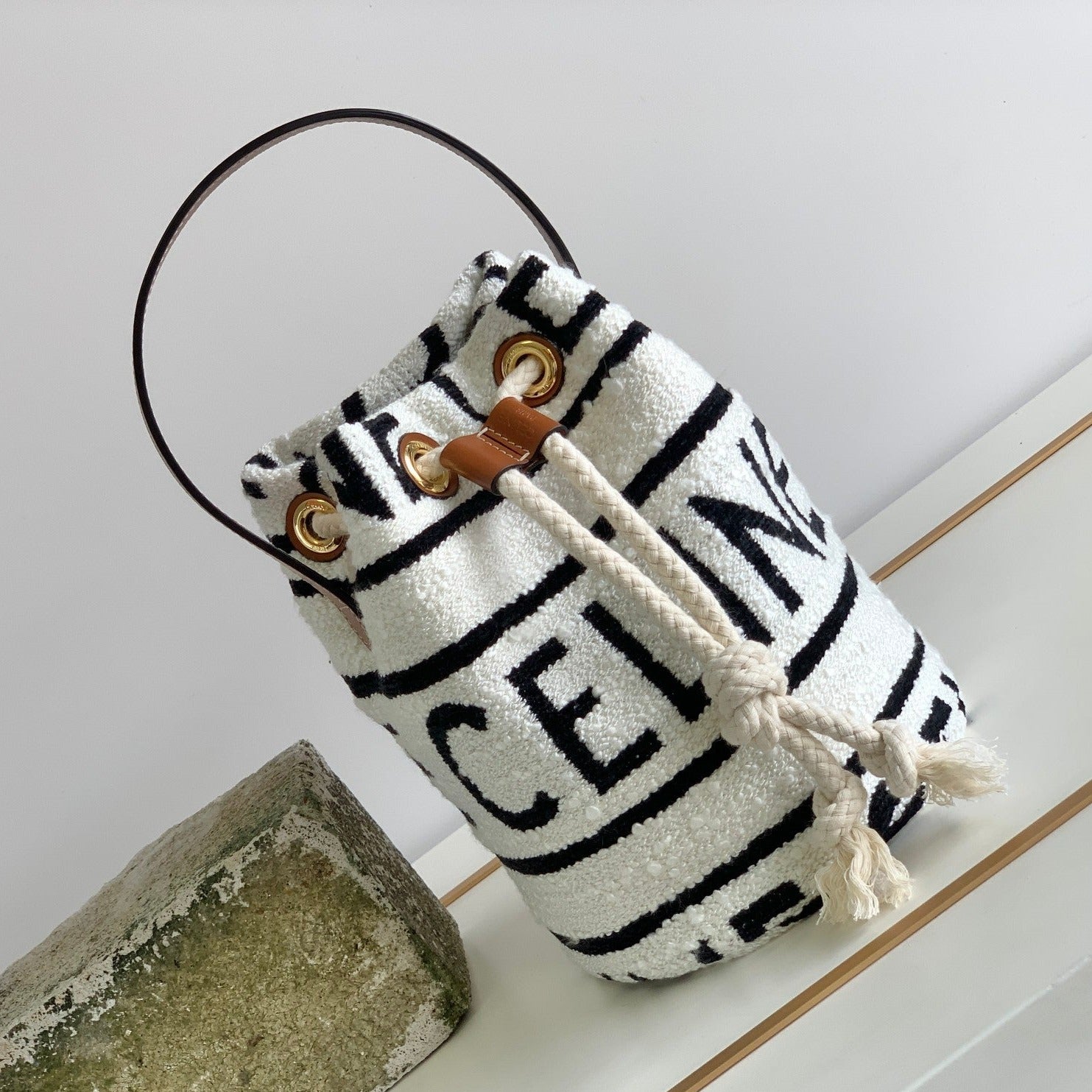 Material: fabric lining, hand carry, drawstring closure, leather handle length 13 cm