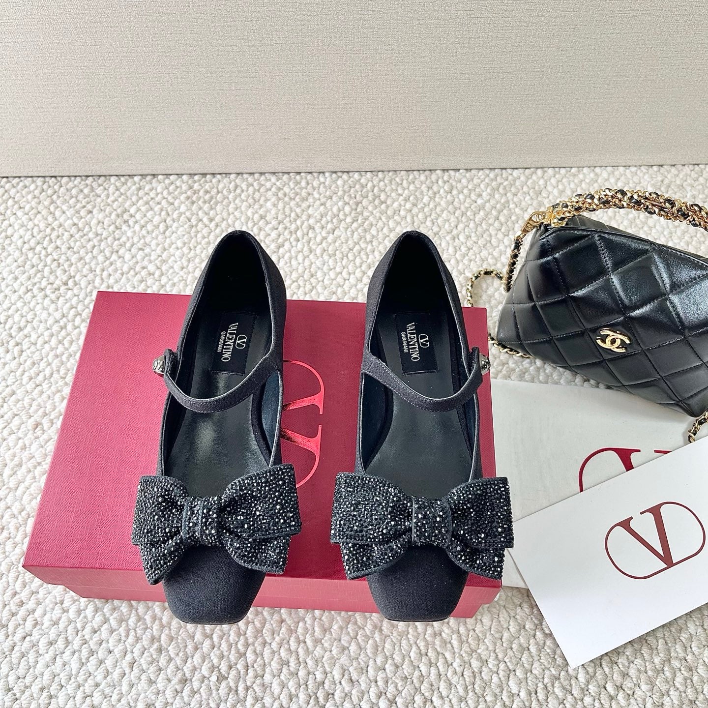 VT 25 Bow Diamond Marry Jane Flat Black Silk