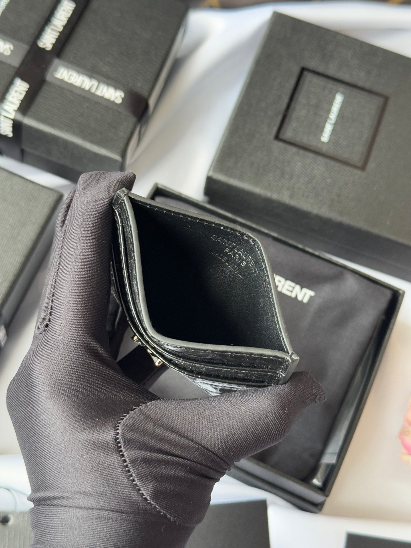 YSL Card Holder 10cm Wallet Black Silver Crocodile Leather 240554