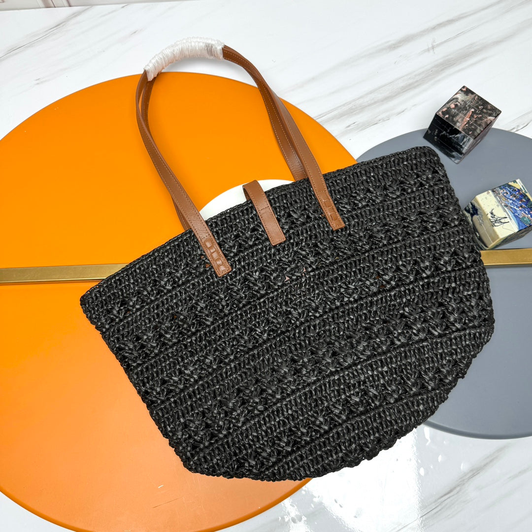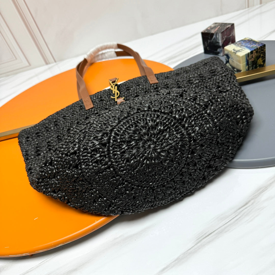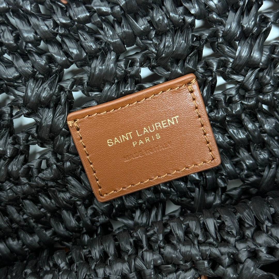 YSL PANIER BAG 55CM BLACK CROCHET RAFFIA TAN CALFSKIN