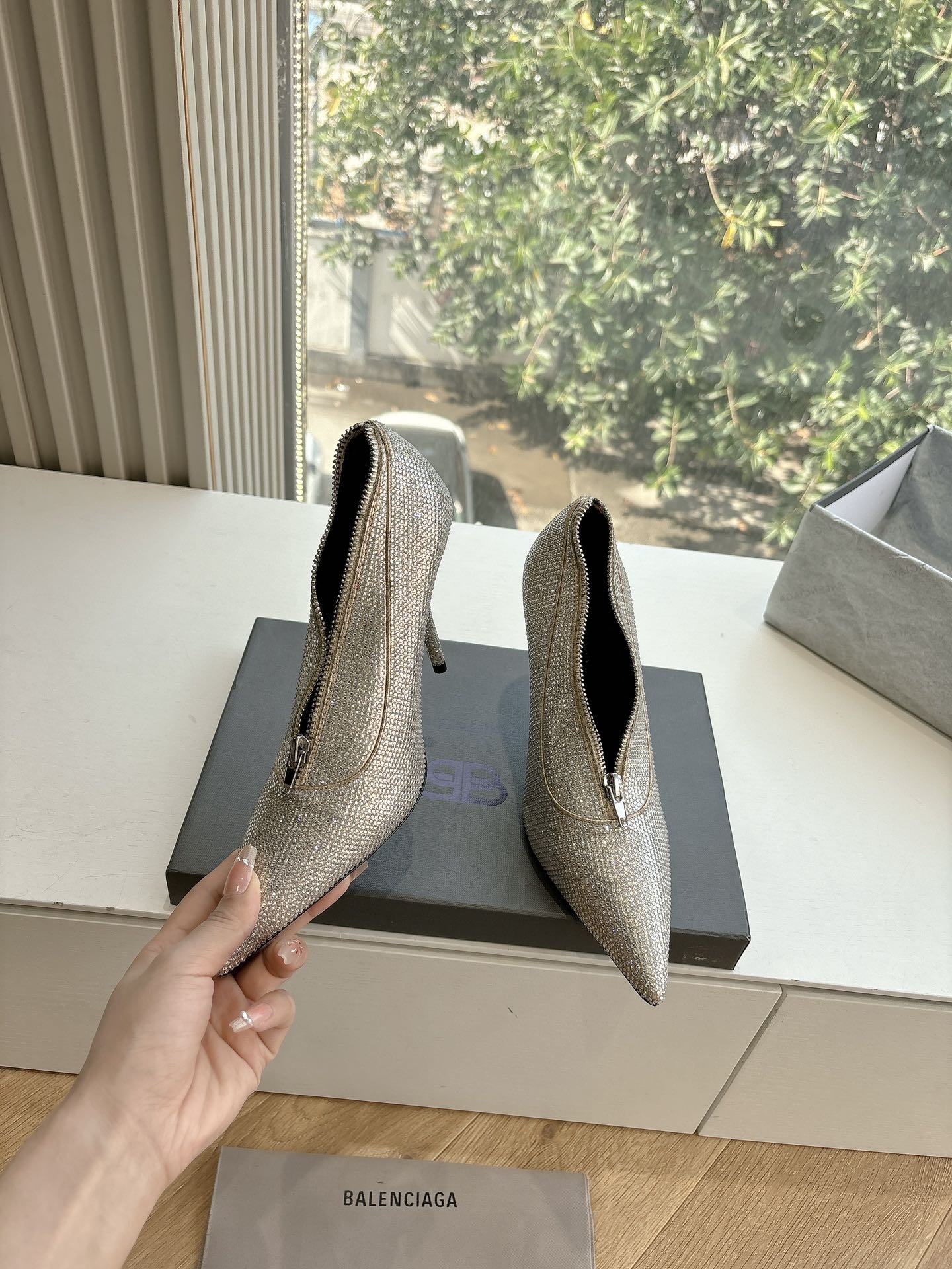 ZIPPER POINTED-TOE HIGH PUMPS IN BEIGE SUEDE ATTACHED SILVER CRYSTAL